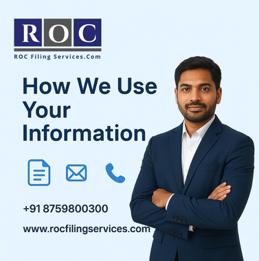 The information we collect is used only for professional purposes. It helps us complete your ROC filings and compliance documentation, send reminders about due dates, improve our services and communication, and meet legal and regulatory requirements.